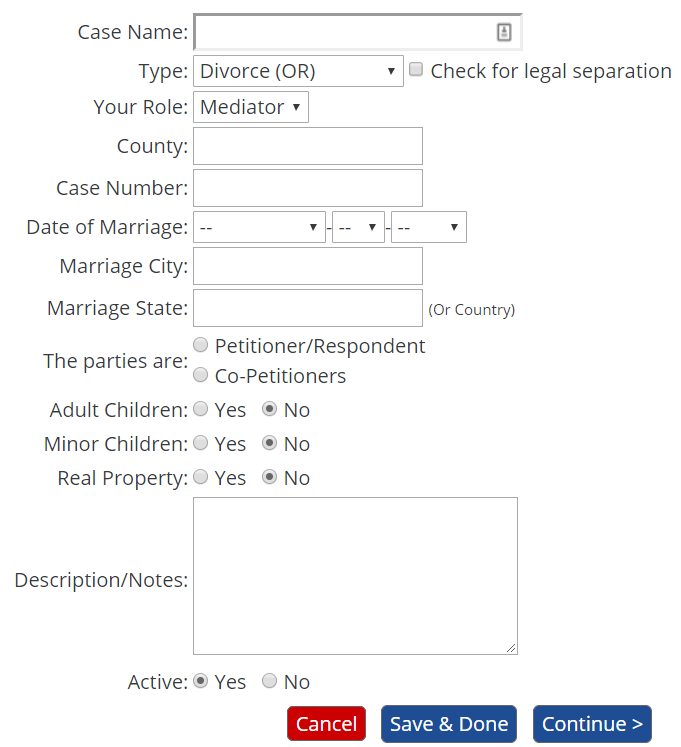 For Oregon cases, create a new Divorce case and check the "Legal Separation" box. Washington legal separations are handled using the mandatory forms.
